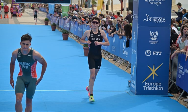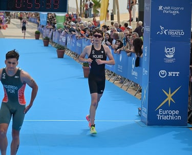 My first European Cup race and race as a junior took place on the shores of the Algarve in March. This was the highest quality field I had lined up against and only my third sprint distance race. I exited the swim around 10th and caught onto the back of the front group after a hard first 2 minutes on the bike. The bike was fairly technical and hilly so I positioned myself near the front throughout and coming into transition I was third off the bike and second onto the run. The race stayed compact for the first bit with a lead group of 6/7 people forming. After that some surges came in that broke up the group, eventually finishing 8th with a 16:40 5k run which was the best I had run off the bike at the time.
